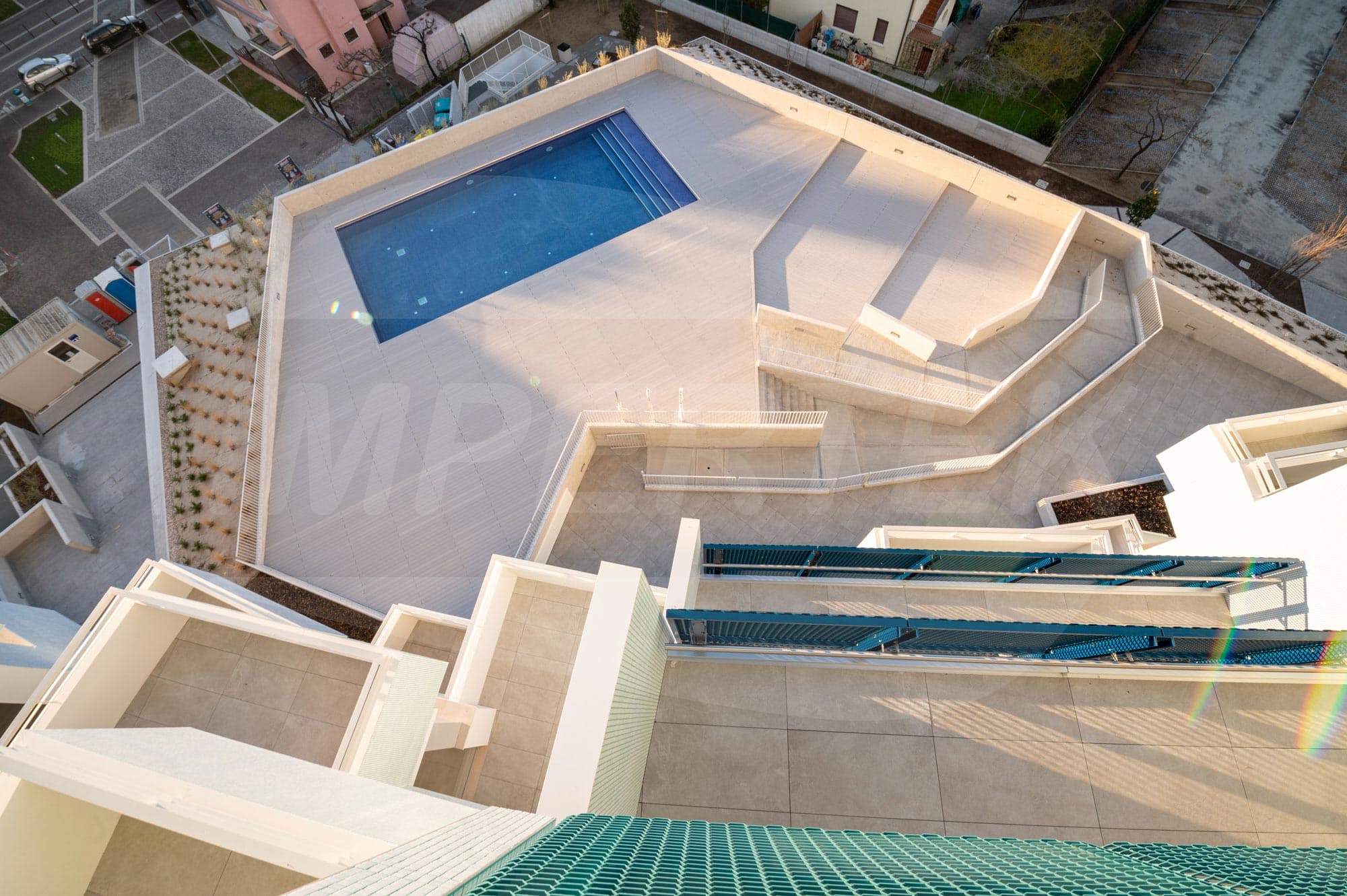 En utilisant plus de 20 000 supports, les concepteurs ont pu apprécier la grande flexibilité qui caractérise le système Impertek, idéal aussi bien pour les planchers tile que pour le decking. Plusieurs matériaux ont été posés dans les différents espaces du bâtiment : des carreaux de céramique ont été choisis pour les terrasses privées des appartements et des parties communes, tandis que pour le solarium et la piscine, on a préféré utiliser un decking en mesure de valoriser toute la grande surface dédiée à l'espace détente.